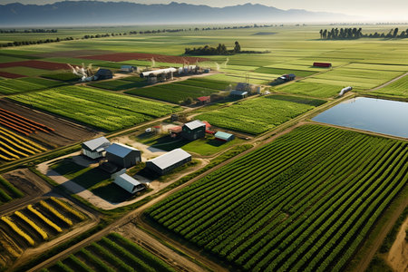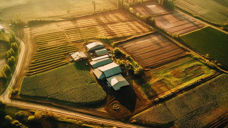Aerial view of peaceful farmstead with barns and fields at sunset. That the image is generated using AI.