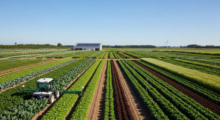 Organic showing lush organic farm with rows of diverse crops including lettuce, flowers, and corn under a bright...