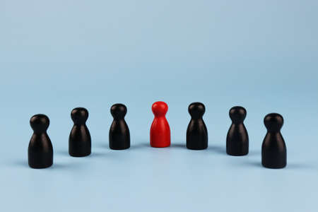 Red wooden figure stepped out to in front of line to leading with each other figure and show different thinking ideas. Leadership and disruption for new normal concept.