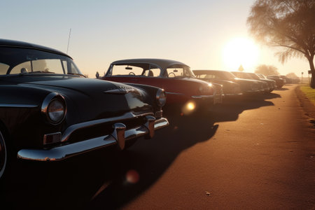 a row of classic cars, lined up and glistening in the sunlight, created with generative ai