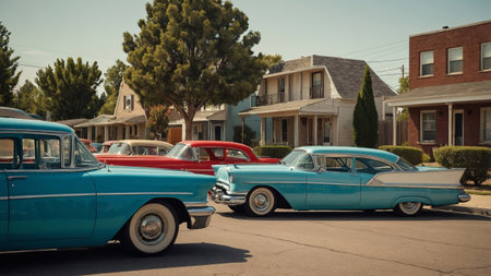 Classic vintage cars parked on a sunny street lined with charming houses in a suburban neighborhood