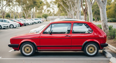 A red Volkswagen Golf MK1 is parked in a lot with other cars and trees in the background. The car is in good condition and looks well-maintained. It is a classic vehicle.