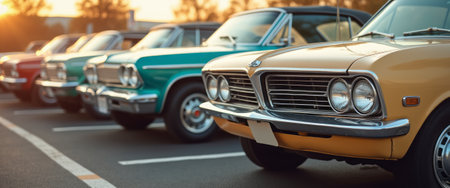 A stunning row of vintage cars, showcasing vibrant colors, gleams under the warm glow of a sunset. Each vehicle, from bright orange to deep blue, tells a story of nostalgia and timeless elegance, inviting viewers to reminisce about the golden age of automotive design.