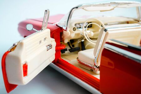 Collection scale model of retro car. Classic car with open door. Rarity. Red toy car on the white. History of automotive industry.