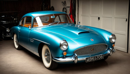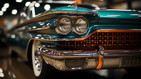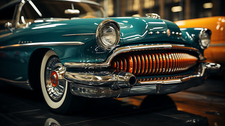 Vintage sports car reflects American culture with shiny chrome grille generated by artificial intelligence