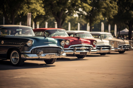 An AI generated illustration of a vintage car show with a row of classic automobiles