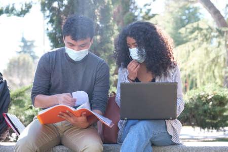 Two latin students wearing protective face mask studying together sitting on a bench outdoor. New normal at university campus.