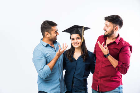 Beautiful young Graduate Indian girl student celebrating success with male friend while wearing graduation ceremony Hat against white background