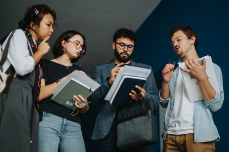 Enthusiastic group of friendly students standing together with notebooks and folders, exuding joy as they celebrate their academic journey and the