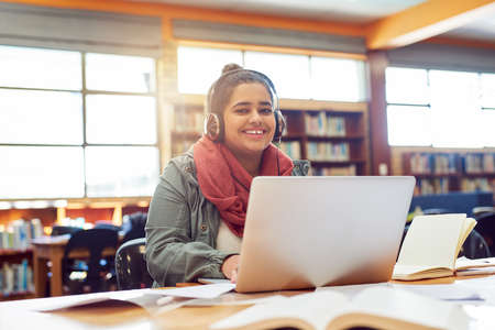 Music makes her perform. Portrait of a cheerful young female student working on a laptop while listening to music with her headphones inside of a library.