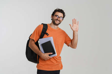 Portrait of college student with backpack behind her back holding books and looking at camera, she finishing her lessons