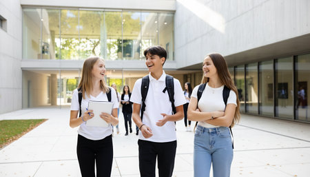 Generative AI : Three of asian student college are walking and talking on the way to classroom in the campus university Education lifestyle concept