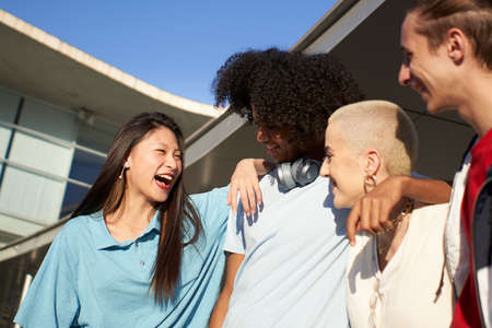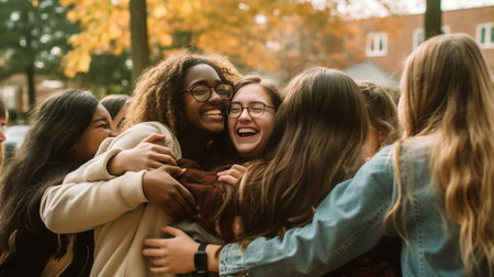Generative AI : Multiracial happy young people stacking hands outside University students hugging in college campus Youth community concept with guys and girls standing together