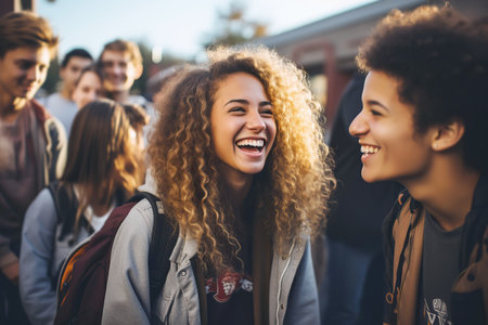 A diverse group of students is shown outdoors, smiling and laughing while holding books. The image displays natural daylight with soft shadows and a blurred background suggesting an outdoor campus setting. This image is suitable for educational materials and general editorial content, conveying themes of friendship and academic life.