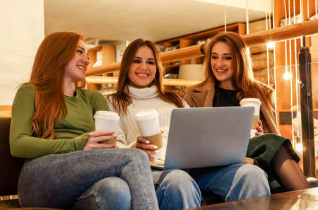 Cheerful women with coffee to go smiling and browsing laptop while resting in cafeteria in weekend together