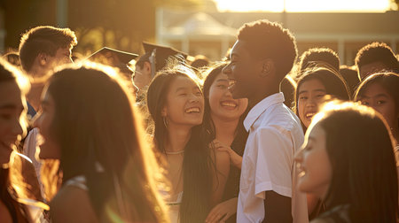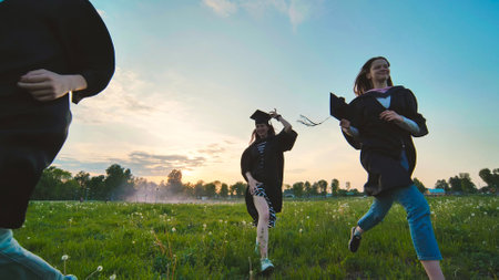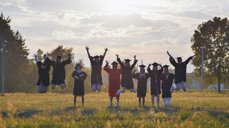 Cheerful students celebrating their graduation, jumping joyfully in their gowns outdoors during a stunning sunset, embracing their achievement