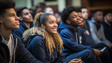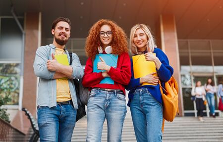 Enthusiastic group of friendly students standing together with notebooks and folders, exuding joy as they celebrate their academic journey and the