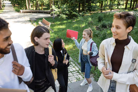 Cheerful interracial students with gadgets and notebooks looking at camera in summer park, banner
