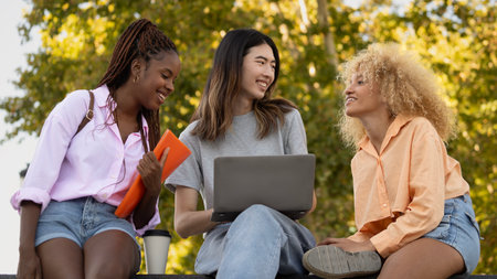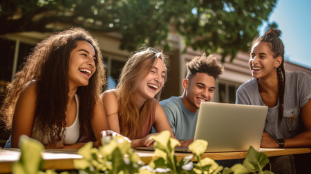 Diverse Group of Students Engaged in Online Learning Outdoors with Laptops and Notebooks, Collaborating and Sharing Ideas in a Natural Setting