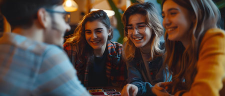 Friends Enjoying a Sticker Guessing Game at Home. Concept Games Night, DIY Fun, Homemade Entertainment, Friendly Competition