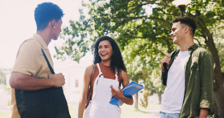 Students, campus and friends laughing in park for break, funny conversation and study talk. Joke, learning and happy people with backpack, smile or discussion in college for school education together