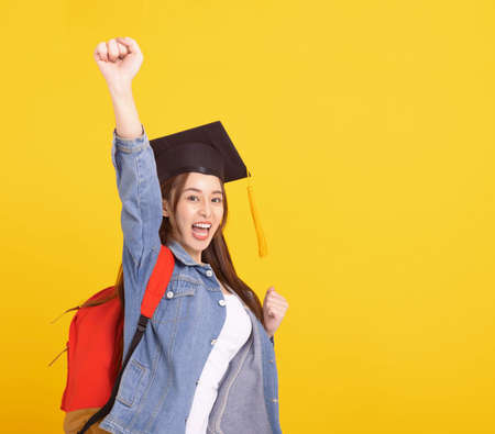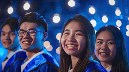 Asian grads radiate joy! Smiling, big-eyed, in dark blue attire against white backdrop. Capturing moments of triumph.