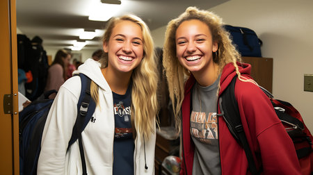 Two student girls with suitcases and backpacks are settled in a student hostel. Beginning of the school year. Girls smiling and looking at the camera. Horizontal photo