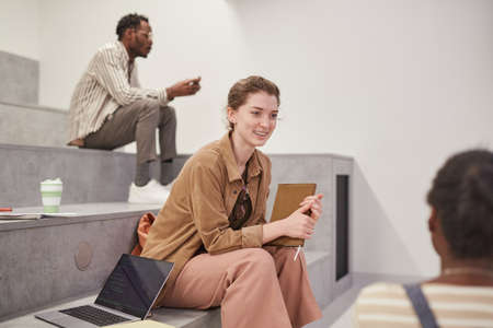 Side view portrait of young female student chatting with friends while relaxing in modern school lounge, copy space