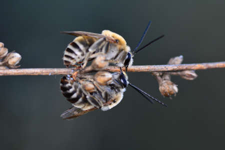 Lateral closeup of a male horned mason orchard bee, Osmia cornuta waiting for some sun on a piece of wood