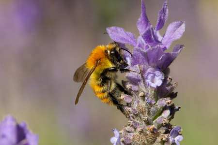 honeybee is collecting honig from a lavender flower in front of blurred background