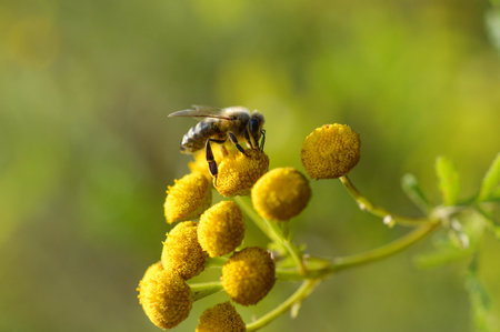 Bee on aa tansy flower or bitter buttons plant pollinating, macro close up, natural background. Bee on a yellow wild flower.