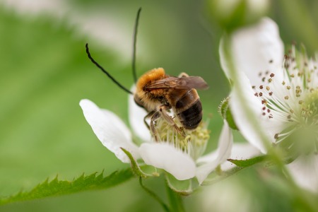 Bee on a white flower collecting pollen and gathering nectar to produce honey in the hive - with right copy space
