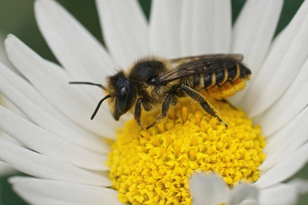 Closeup on a fresh emerged female patchwork leafcutter bee, Megachile centuncularis sitting on a white yellow flower in the garden