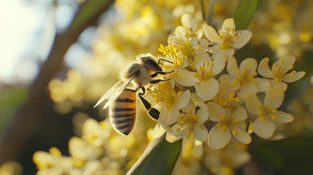 A bee is intently collecting nectar from bright yellow flowers in a garden, surrounded by greenery. The warm sunlight enhances the colors, showing the beauty of nature.