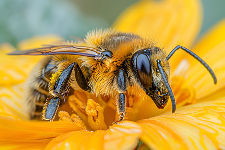 Busy honey bee picking up pollen from a yellow flower generated by artificial intelligence