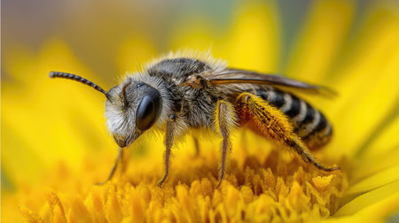 A detailed close-up of a bee with black and yellow stripes, collecting nectar from the center of a vibrant flower. The bees legs are covered in pollen as it methodically moves from one blossom to another. Generative AI