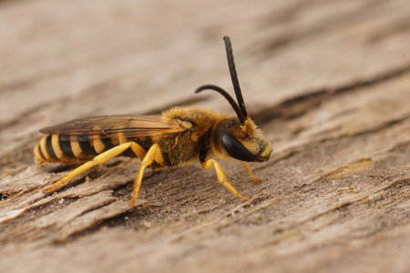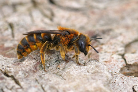 Detailed closeup of male red-girdled mining bee, andrena labiata sitting on wood