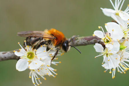 A closeup of a male gray patched mining bee sipping nectar on white flowers of blackthorn, Andrena nitida, Prunus spinosa