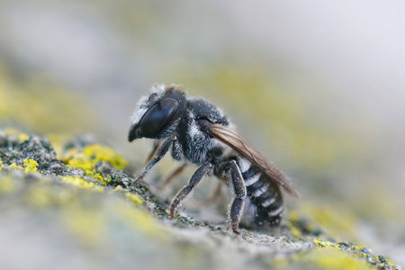 Lateral closeup of a male horned mason orchard bee, Osmia cornuta waiting for some sun on a piece of wood