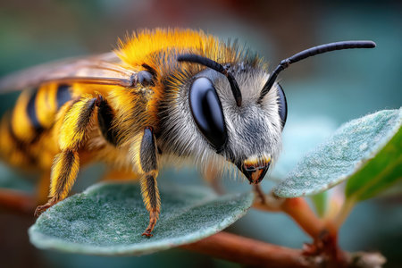 A macro shot revealing a fuzzy yellow and black bee delicately perched on a lush green leaf, highlighting its intricate eyes and slender antennae amid