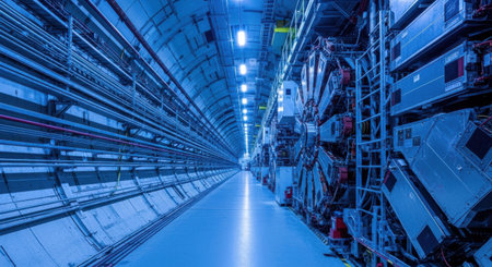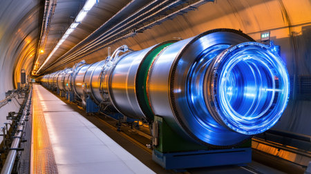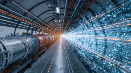 A breathtaking tunnel displays a particle accelerator featuring a glowing beam line and advanced detector arrays used in high-energy physics.