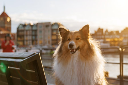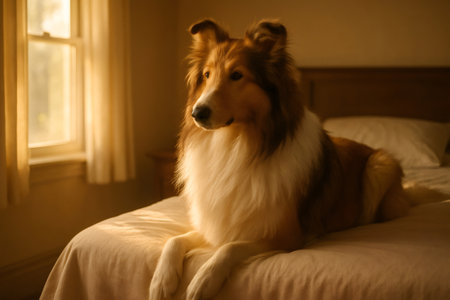 Collie dog resting calmly on a comfortable bed with golden morning light coming through the window, creating a warm atmosphere