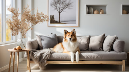 A charming Collie lounges on a pristine white living room rug. Ai Generated.
