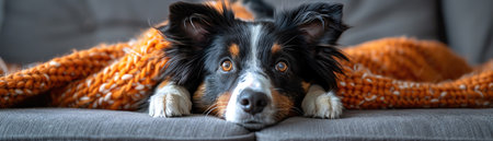 Border collie resting on a sofa, bright window light, soft and cozy setting