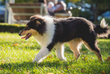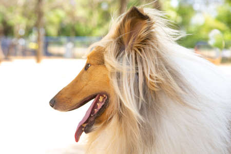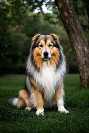 The Tricolor Rough Collie, Scottish Collie, Long-Haired Collie, English Collie, Lassie Adult Dog Sitting On The Ground In Summer Sunny Day.