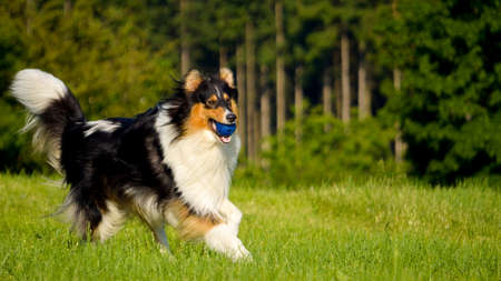 panorama panoramic Funny Young Shetland Sheepdog, Sheltie, Collie Fast Running Outdoor In Snowy Park. Playful Pet In Winter Forest