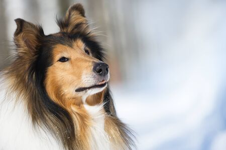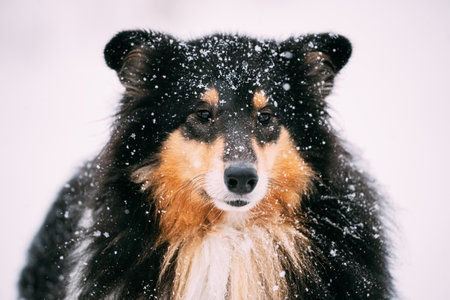 Close View Of Shetland Sheepdog, Sheltie, Collie In Snowy Winter Day