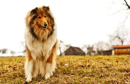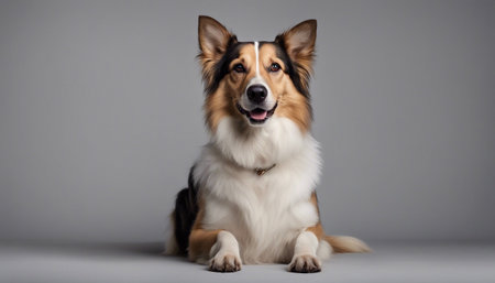 Studio shot of a beautiful Shetland Sheepdog sitting on grey background.
