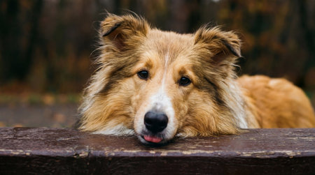 a close up shot of a collie dog resting its head on a dark wooden surface its tongue is slightly sticking out in a cute and adorable way