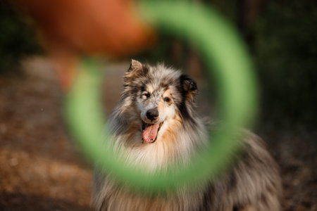 This vibrant and captivating image showcases an Australian Shepherd dog in a state of pure excitement and joy The dog s mouth is open tongue hanging out and its eyes are sparkling with an animated